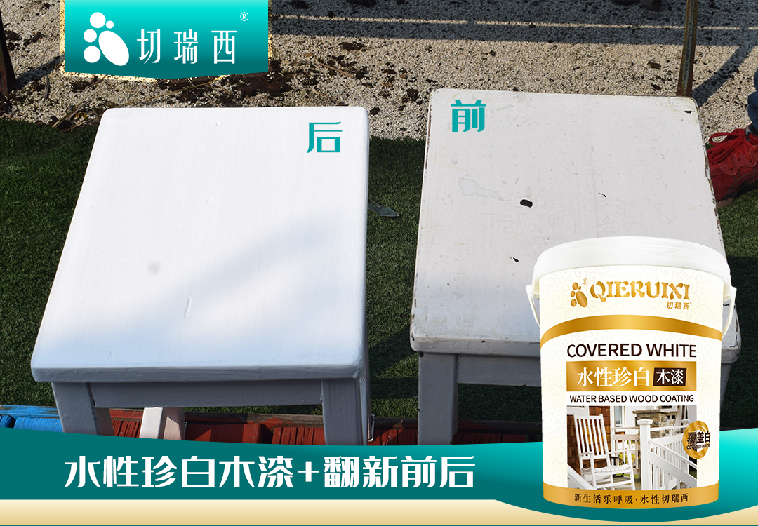 水性珍白木漆自身即为覆盖白色涂料,无需添加色浆调色。实木凳翻新前已出现漆膜脱落,污渍无法清除的现象,使用水性珍白木漆翻新,实干后表面的漆膜光滑柔润,耐水耐脏污且不易黄变。