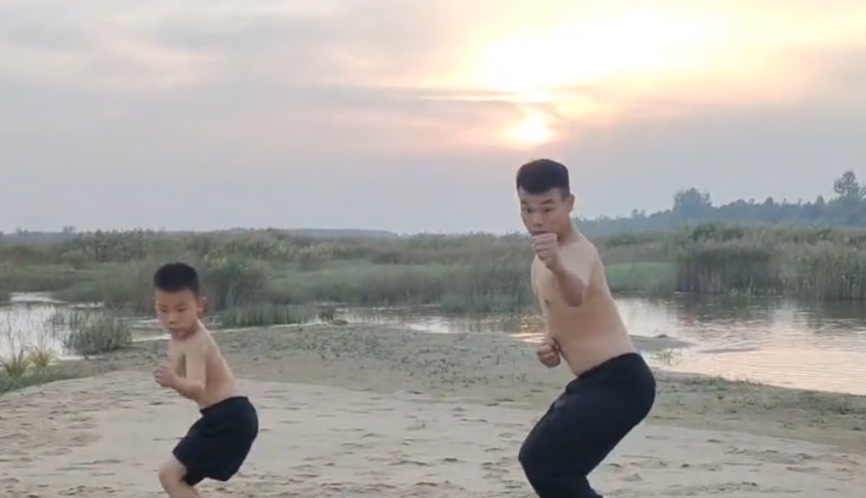 到了中午,他便带着孩子们练习半个多小时的武术步法等,甚至到了晚上,父子四人都不得一刻清闲。