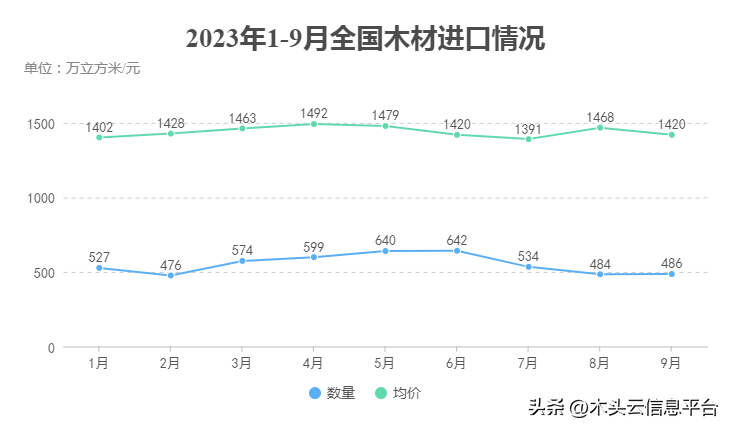 其中,原木进口同比下降13.49%至2862万立方米;锯材同比增长7个百分点至2104万立方米。按月份来看,9月的进口量较8月略微上涨,到港均价有所下降,每立方米的平均到港价格在1420元左右。