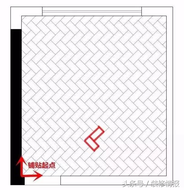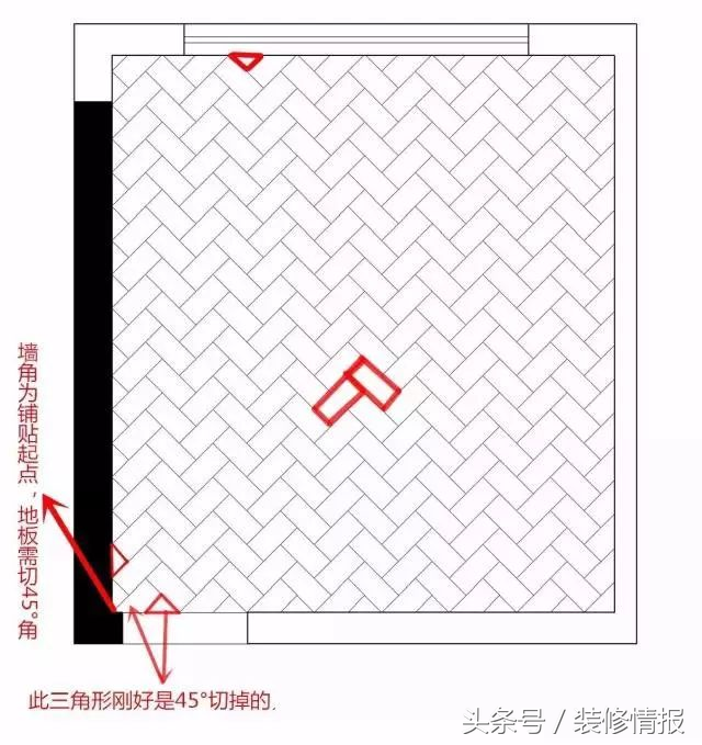 2、以墙的中心点为起铺点,第一块不用切角,但是这样铺设墙边小角会有点很多,因为左右两边的都不是三角形,相互不温和,所以损耗比第一种要多,大约在6%左右。