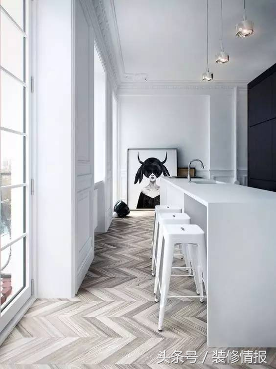 鱼骨拼花的造型就像鱼骨头一样错落有序地排列开来,丰富的纹理使空间充满了立体感,瞬间让房子腔调十足。它一般被应用于文艺feel十足或比较奢华的装修风格中,无论在铺贴技术、施工价格、视觉水准等各方面,都堪称地板里“最低调的奢华”。