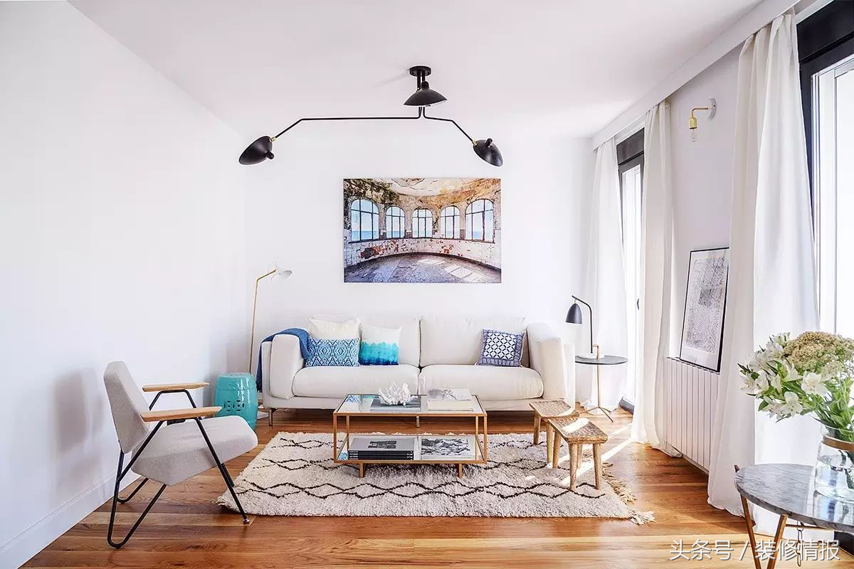 如果是小户型,或者采光不太好,那么浅色地板就是首选。再配上白墙,让空间更亮、显得不那么拥挤。选择浅色地板,要避免过于繁复的软装,家具选择简洁、细腿的北欧、MUJI风格,整体配色使用黑、白、灰和原木,适当搭配几件彩色单品提亮空间。