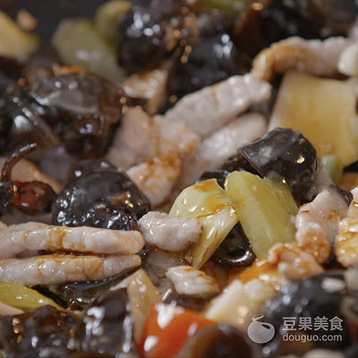 4、倒入木耳,不断翻炒,再加适量泡菜水、酱油炒匀;