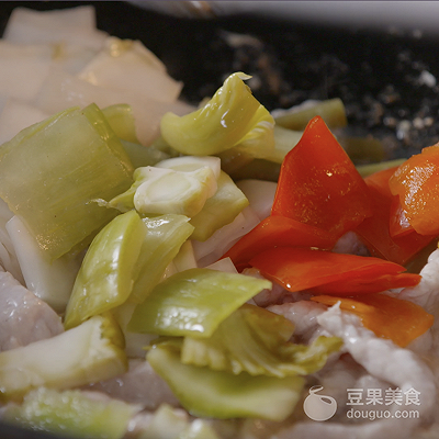 3、热锅起油,下里脊肉炒到七八成熟了,加蒜蓉、姜蓉、泡菜、泡椒炒香;