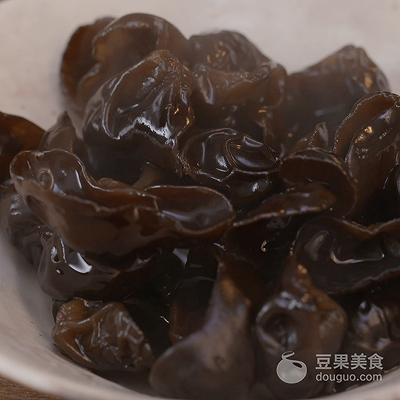 1、50克小朵黑木耳泡发,过沸水煮5分钟,捞出;