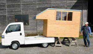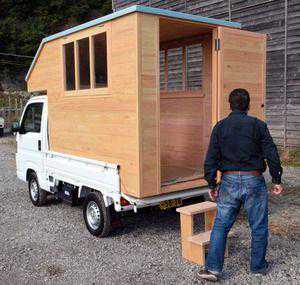日本一家锯木厂推出了一种用日本柏树建造的移动小屋,这种木屋可以安装在轻型卡车上,用作休闲设施或紧急避难所。