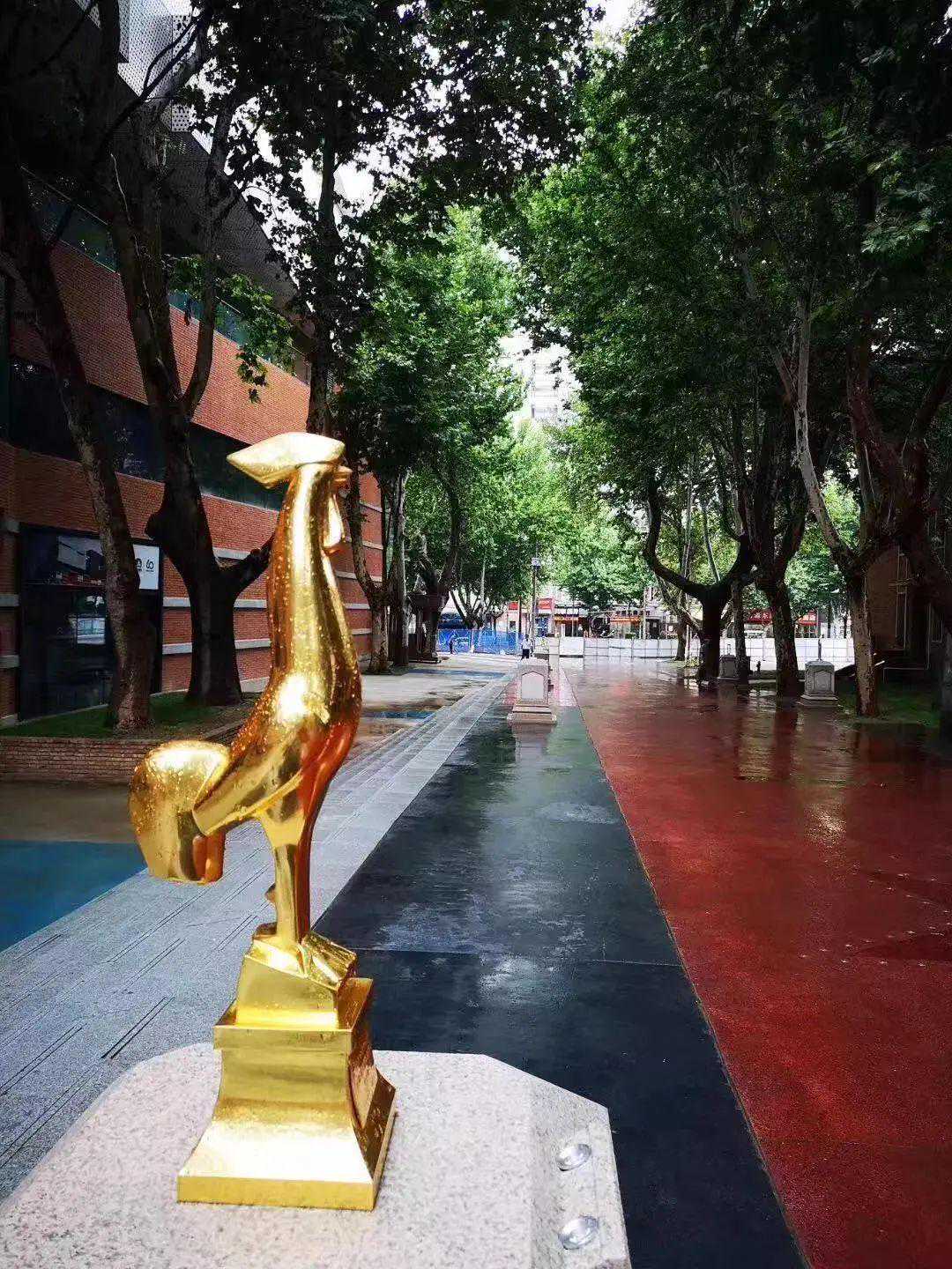红砖楼西侧,新建了一条南北走向的星光大道,道路两侧立着几十尊电影奖杯主题雕塑:金熊奖、金麒麟奖、金鸡奖……游客纷纷拍照留影。