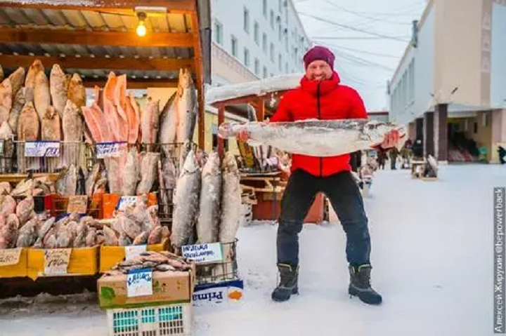 前面提到过,这里无法进行农作物的种植,即便是夏天种了,也等不到生长成熟,就会被冻透了。雅库茨克最主要的食物就是肉,尤其是鱼肉,种类还挺多。不过你可看不到市场上里活蹦乱跳的鱼,它们都被整齐地摆放在摊位上,好像英国的星空派一样的,张着嘴,仰望着天空。