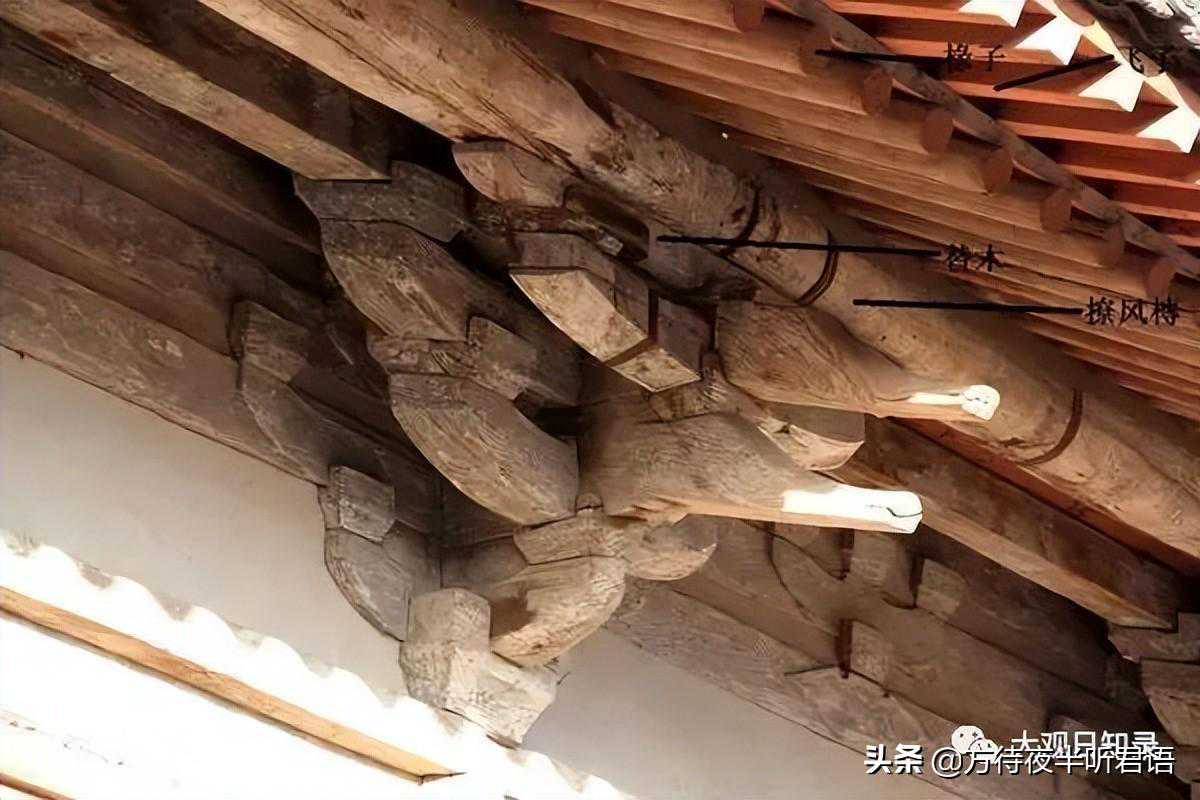 [11]托脚,自梁端向里斜托向上一槫缝的枋木。托脚是支撑平槫的构件,唐至元代使用较多,明清时期已极少用。
