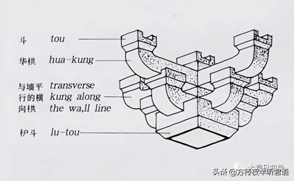 [12]交互斗,位于横拱与华拱相交处,承托横拱和华拱传来的双向合力的拱。开口十字形。