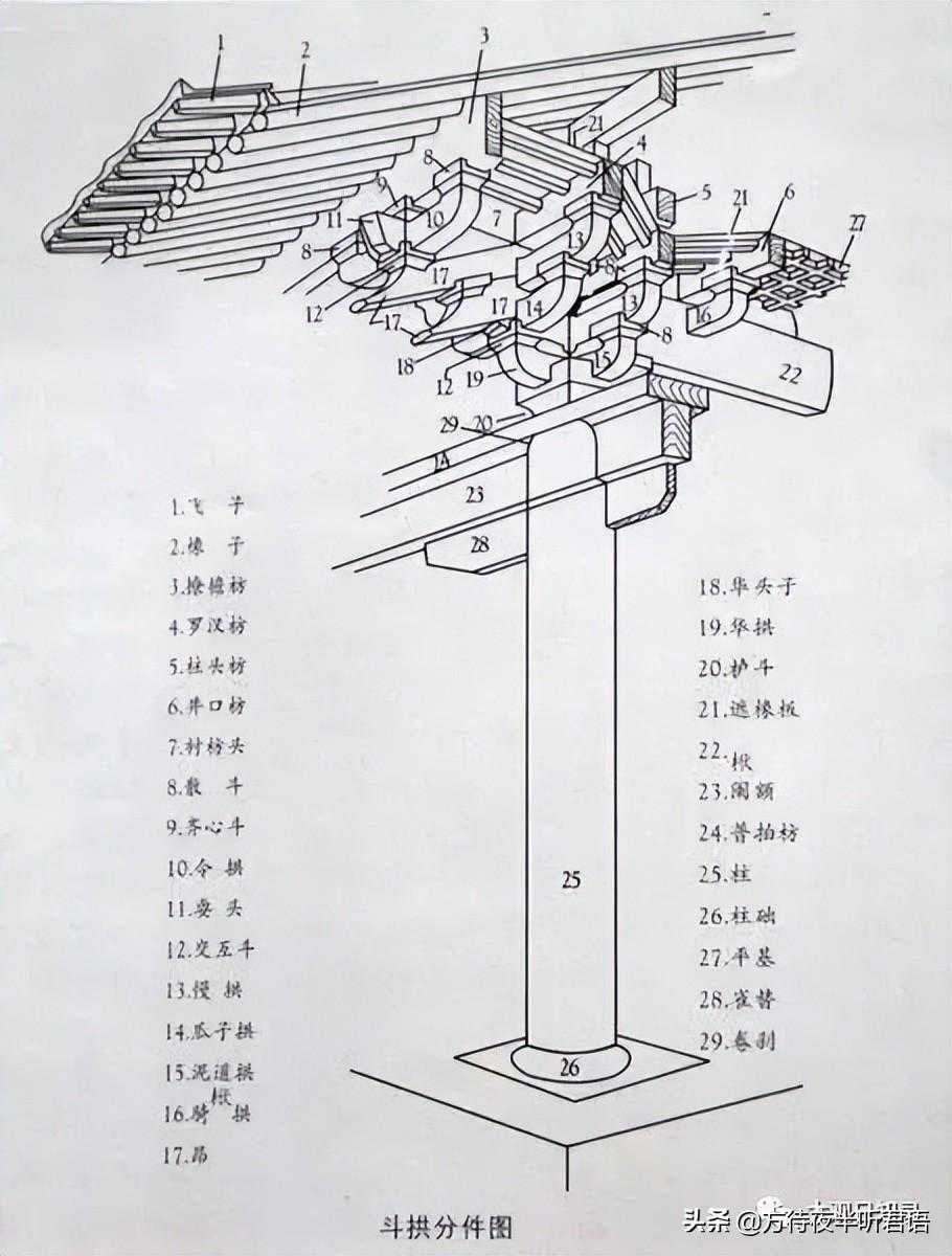 [20]栌斗,又名大斗,栌斗在全攒斗栱最底层,承托全攒重量的斗状方木块,开十字卯口。清称坐斗。