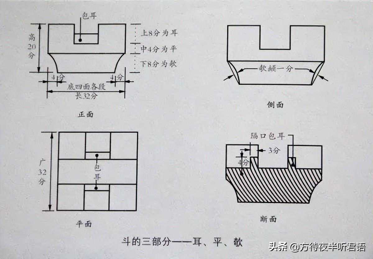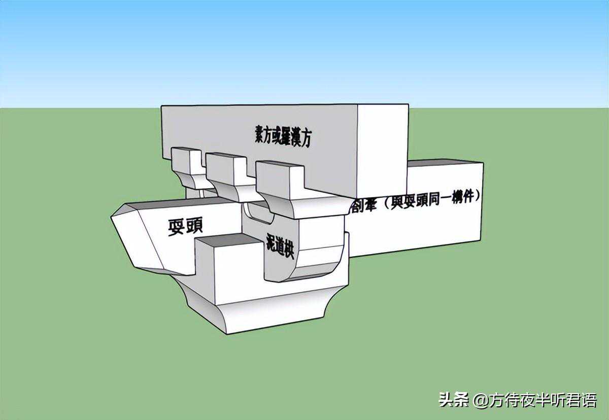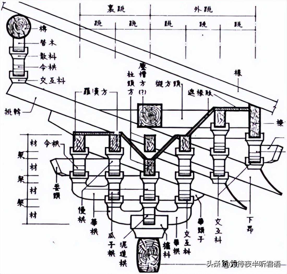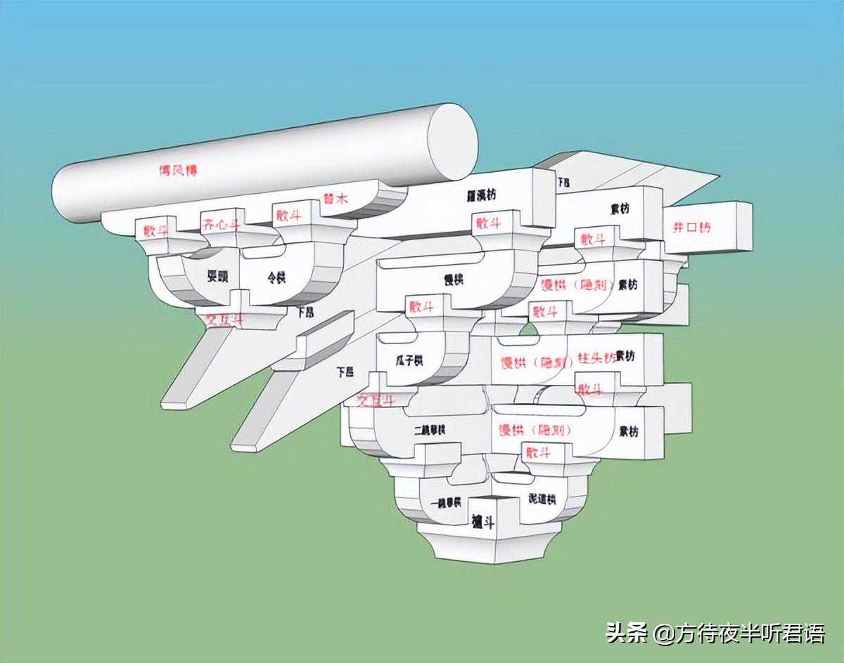 首先,判断出跳数,出跳的部件只有华栱和昂,一般有几个就出几跳,数呗!注意昂式的耍头不要计入,如上图外跳一个华栱和两个昂,则为出三跳;里跳出两华栱,则为出两跳。斗栱每增高一层为一铺。出一跳为四铺作(至下而上层叠为栌斗、华栱、耍头木、衬方头共四铺,故称四铺作)出两跳为五铺作、出三跳为六铺作…以此类推;一般出跳数不超过六跳。