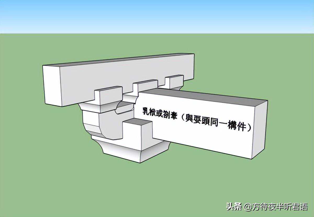 [11]耍头,最上一层栱或昂之上,与令栱相交而向外伸出,昂之上,切与昂平行大小相近的直木;衬方头下所用出跳木料,多为蚂蚱头状。清式称蚂蚱头。耍头前后两端都露在外面,外端多作蚂蚱头状,里端作成麻叶头状。