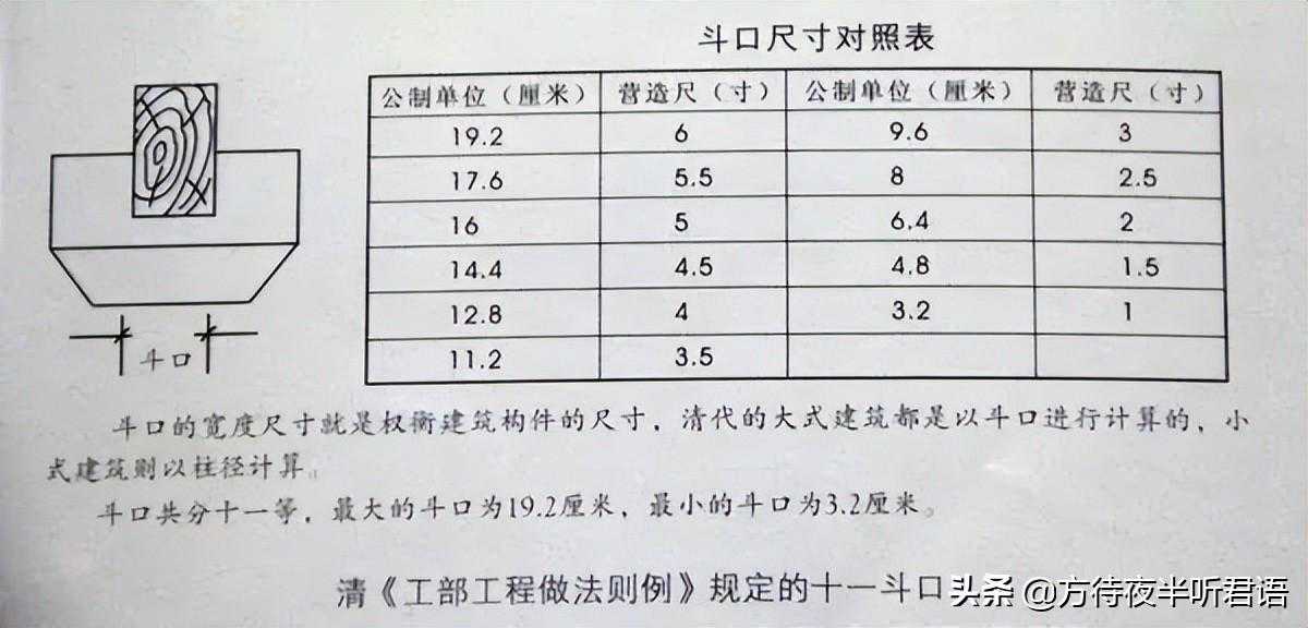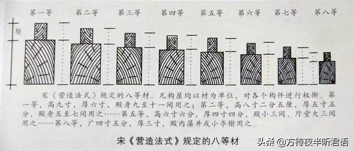 凡构屋均以材为单位,也就是说一个建筑修多大几间那么对于的材用几等就决定了,同样斗口(斗栱)的大小也决定了。斗栱或素方用料的断面尺寸为一材,高宽比为3:2。栔(音自zi)两层栱之间填充的木件断面尺寸,"一材一栔"为足材。其中材高15分,宽10分,栔高6分,宽4分;可见一足材为21分,材分八等。一等材6寸×9寸,相当于四个八等材。如柱径大小为2足材~3材,即42分~45分之间。足材拱高21“分”,宽仍为10“分”。