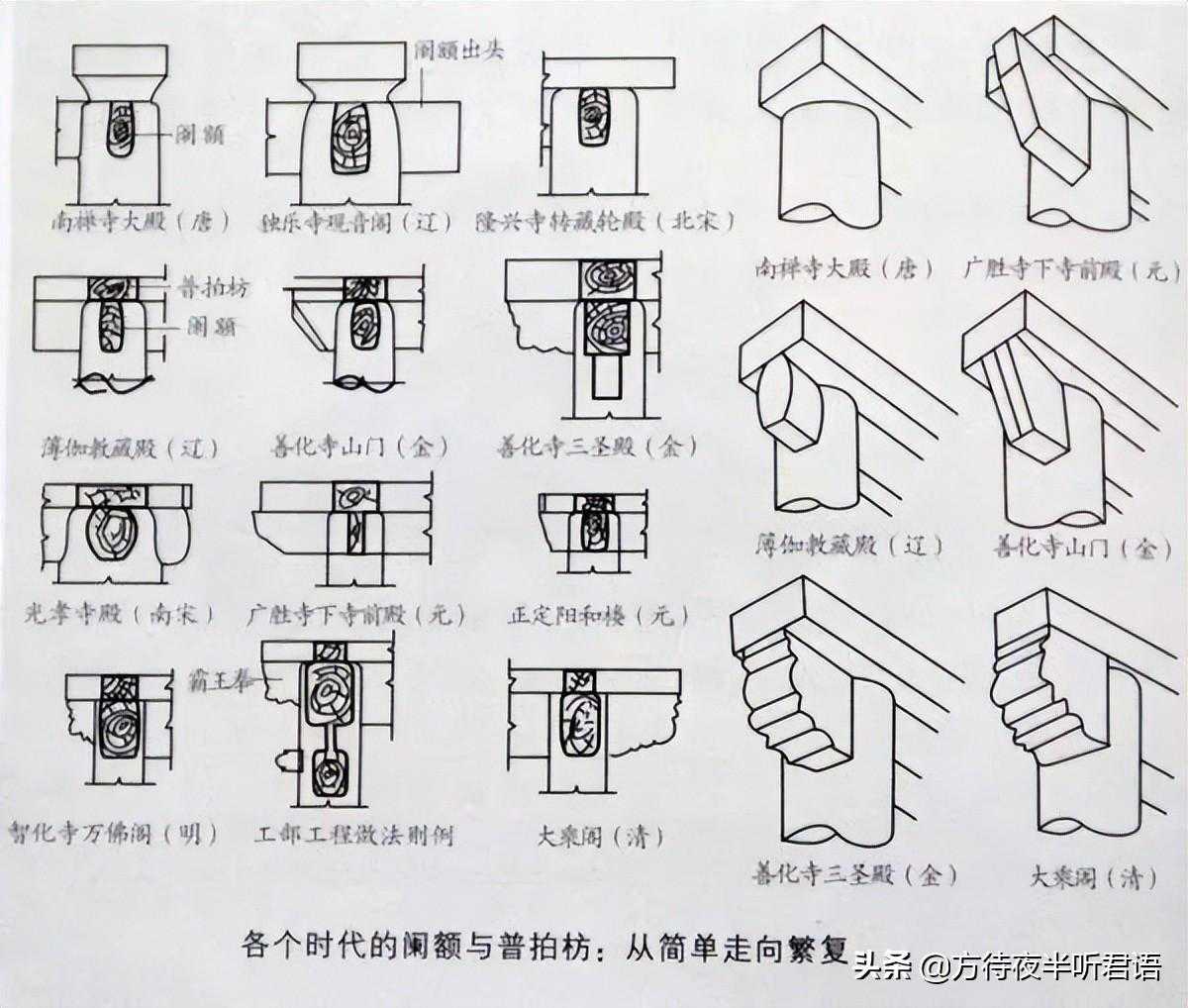 [24]普拍枋,位于阑额之上,与阑额在断面上作‘T’字形,用来承托斗栱的木结构。四周交圈,犹如一道腰箍梁介于柱子与斗栱之间,既起拉结木构架作用,又可与阑额共同承载补间铺作。明清称为平板枋。始见于唐代,目前最早的实例为五代时期山西大云院大殿。