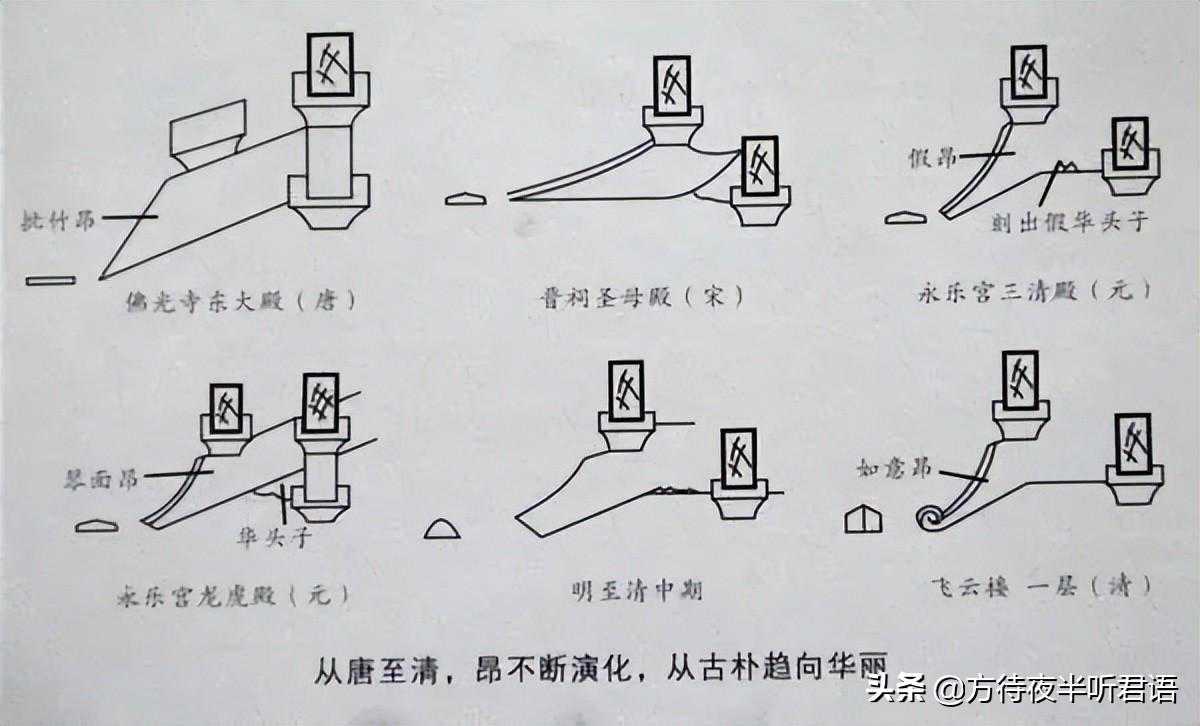 昂的演变是从大至小、由简至繁、由真变假,同时也从唐宋时的结构件演变到明清的装饰件。自宋起,有将华栱栱头做成昂式的,其结构作用与栱无异,此种昂称为假昂,与上述真昂并用。元代起假昂渐居统治地位,清代则已全部用假昂。昂的外观,又有批竹、琴面及象鼻多种。也有将耍头作成昂状的,称昂式耍头。