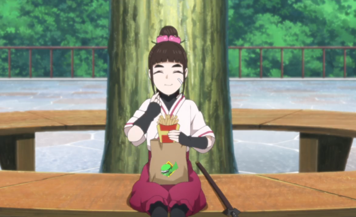 在本集的末尾解释了铁椿为何嘲讽忍者,原来她是一名傲娇的武士,嘴上说着忍者的各种坏话,拒绝蝶蝶的薯条。等到没人的时候,铁椿却拿出单独买来的薯条品尝味道。薯条对于铁椿来说堪比人间美食,脸红表露出铁椿的傲娇性格,与之前的铁椿形成鲜明对比。