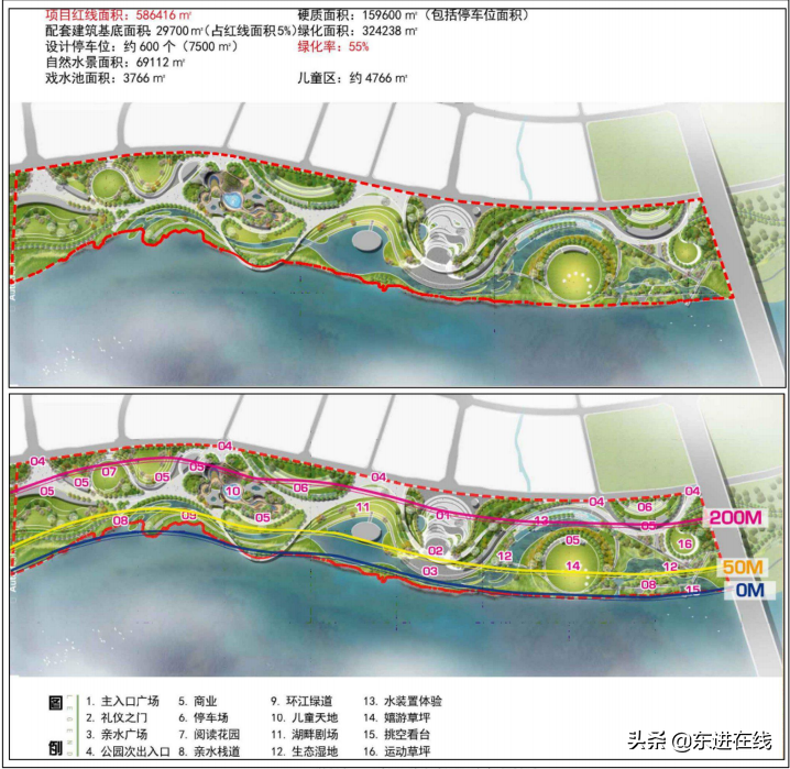 广场硬质铺装130368平方米,自然水景76893平方米,公园地面停车场11835平方米,戏水池7459平方米,绿化226257平方米,儿童区11917平方米,亲水驳岸2826米,1号景观桥梁930平方米,2号观景飘桥1680平方米,观景台10450平方米。
