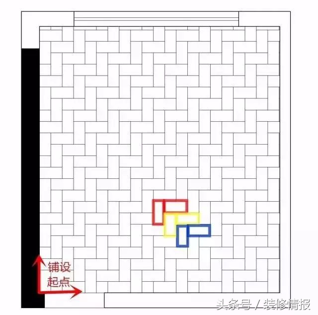 2、以墙的中心点为起铺点,第一块不用切角,但是这样铺设墙边小角会有点很多,因为左右两边的都不是三角形,相互不温和,所以损耗比第一种要多,大约在6%左右。
