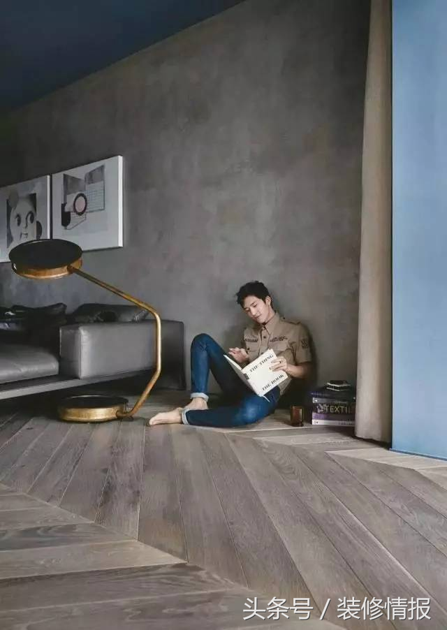 之前大火的井柏然的家,地板就是鱼骨拼接设计,灰色和原木色相间,与他家工业风的设计完美融合。