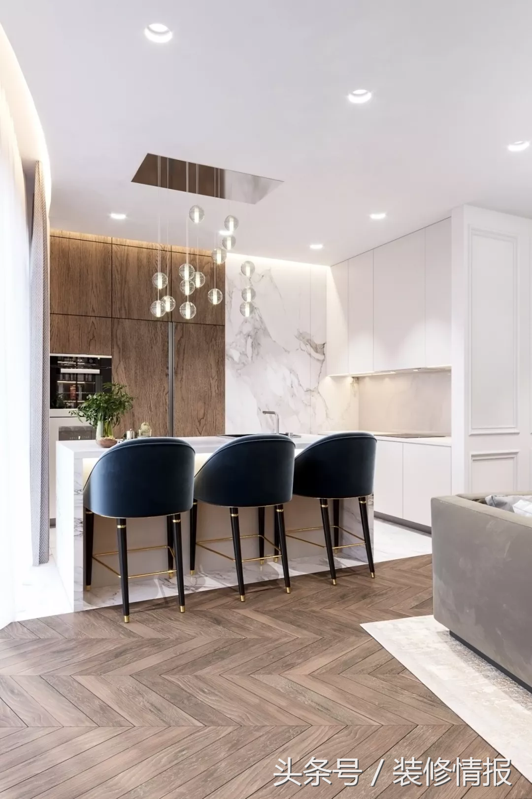 鱼骨拼花的造型就像鱼骨头一样错落有序地排列开来,丰富的纹理使空间充满了立体感,瞬间让房子腔调十足。它一般被应用于文艺feel十足或比较奢华的装修风格中,无论在铺贴技术、施工价格、视觉水准等各方面,都堪称地板里“最低调的奢华”。