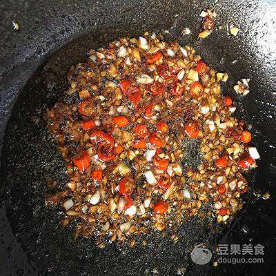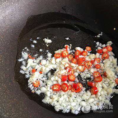7、另起一锅,锅中放入少许油,加入大蒜和小米椒炒香