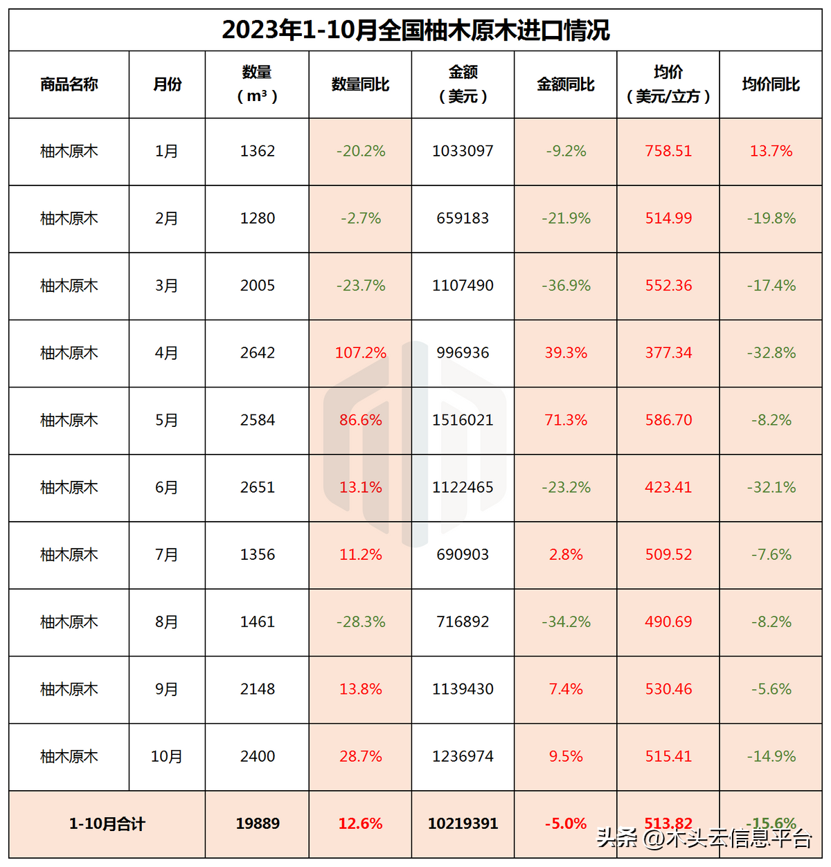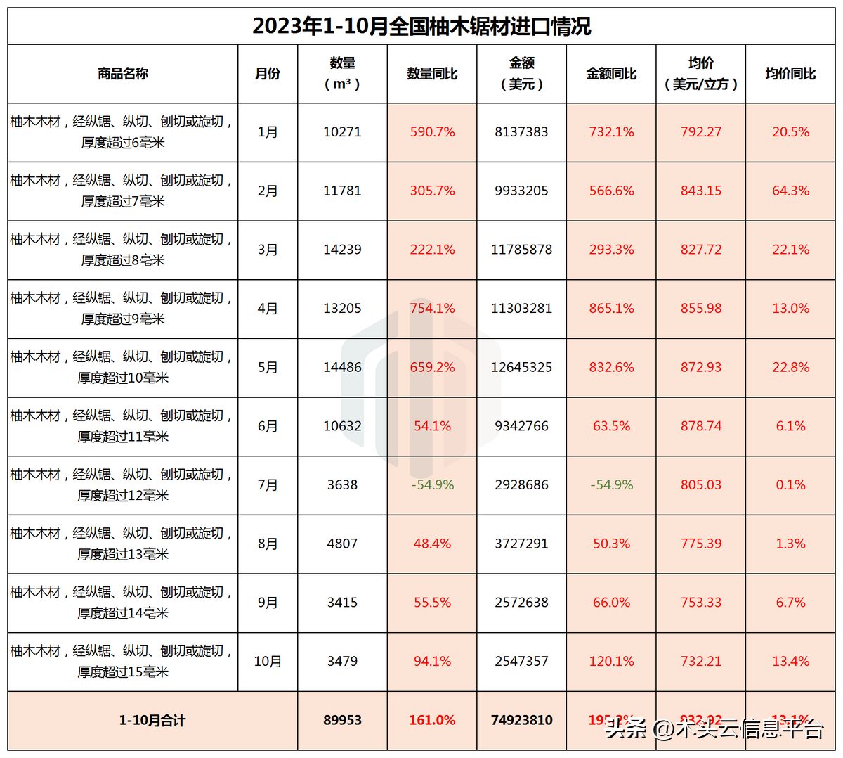 前10个月,全国累计进口柚木原木总量达1.98万立方米,同比上涨12.6%;按美元计,进口总值达1021万;平均进口单价514美元/立方,同比下降15.59%。