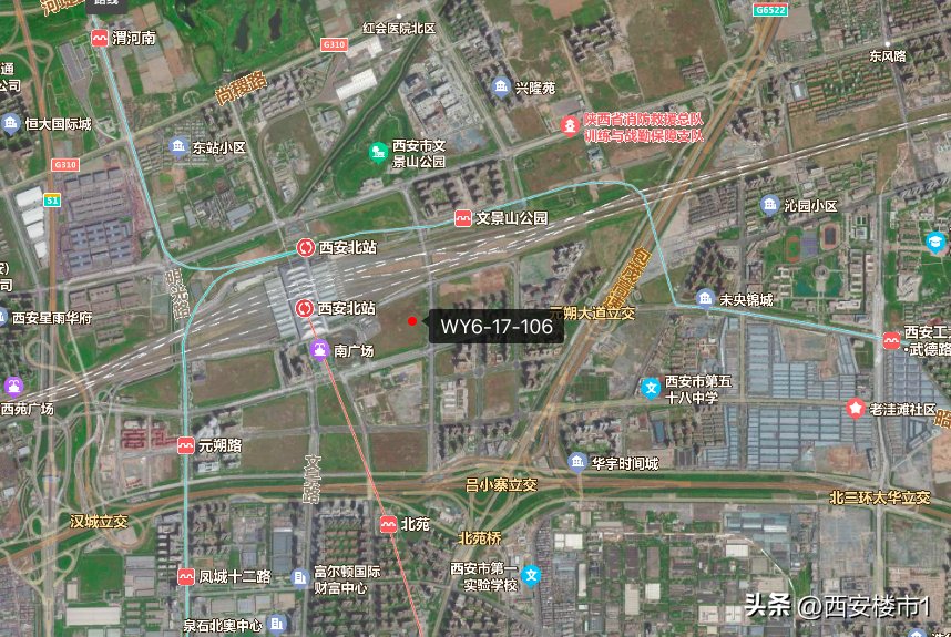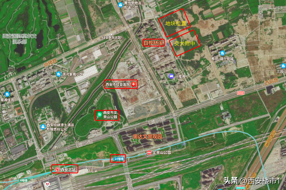 地块位置在西安北站以东,交通比较便利,有3条地铁线(2/4/14号线),地铁可以直达机场。周边有红会医院(高铁新城院区)、陕西中医药大学附属医院经开院区(在建)、经开区第十四小学、文景山公园等,配套比较齐全。