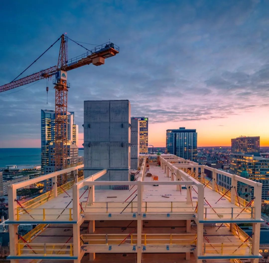 这座25层高的建筑于7月开放,有一个混凝土底座、电梯和楼梯井,其余结构由交叉层压木材(CLT)和胶合木制成。