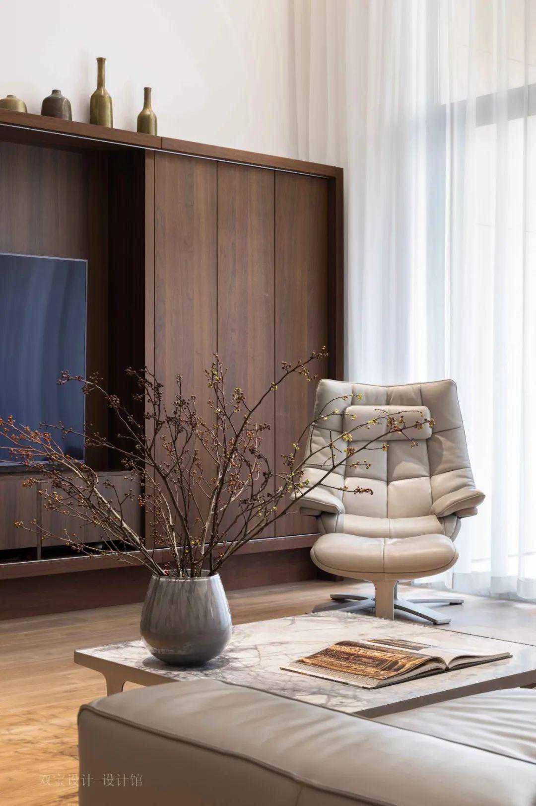 ▲电视墙的定制电视柜是胡桃木色的设计,外观简洁布置电视机后,带来一种沉稳端庄的氛围感。
