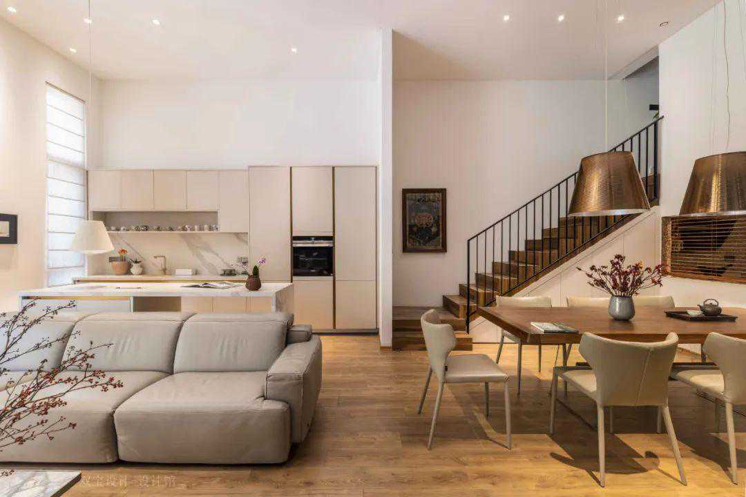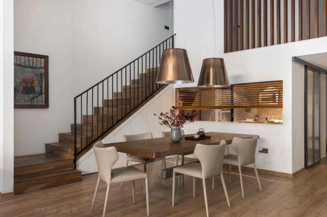 ▲餐厅旁边则是房子的楼梯,黑色扶手+木质踏步,楼梯下的空间装上柜门作为收纳柜使用,整个空间设计简洁大方而实用。
