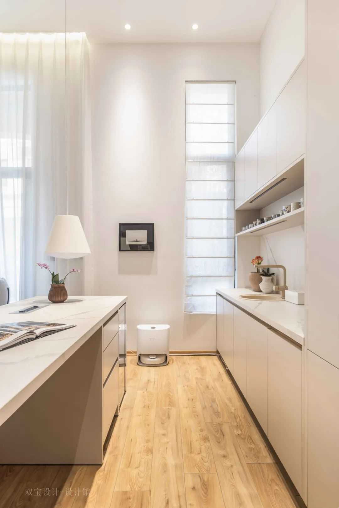 ▲在沙发后方的中岛台,雅白的石材台面,布置成一个实用优雅的操作台面。
