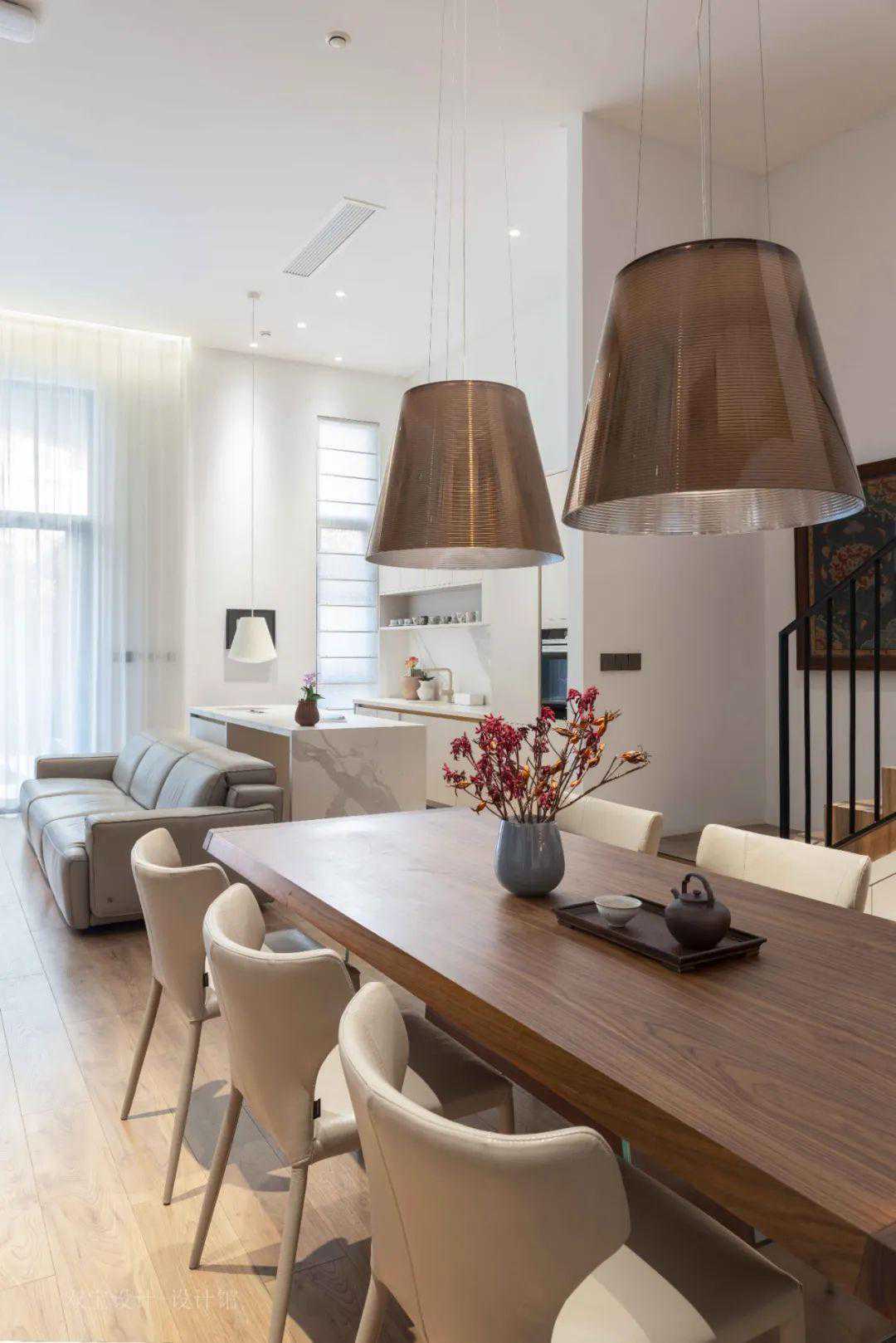 ▲厚板台面的实木餐桌,搭配卡其色皮艺餐椅,还有铜色吊灯,整个餐厅的软装质感与木地板的材质保持一致,风格和谐自然。