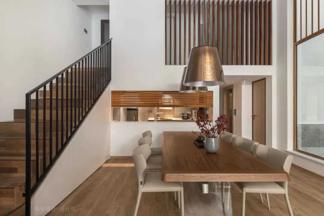 ▲餐厅上方的二楼过道,以木栏栅作为隔墙,则是让二楼过道也有着更加雅韵的设计效果。