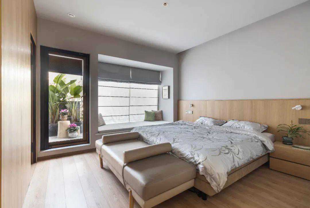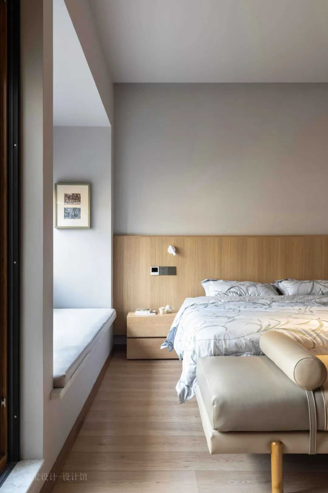 ▲卧室地面、墙面都以同样的橡木色材质,布置上卡其色的皮艺床与床尾凳,加上灰色乳胶漆墙面与天花,布置出一个简约舒适而卧室空间。