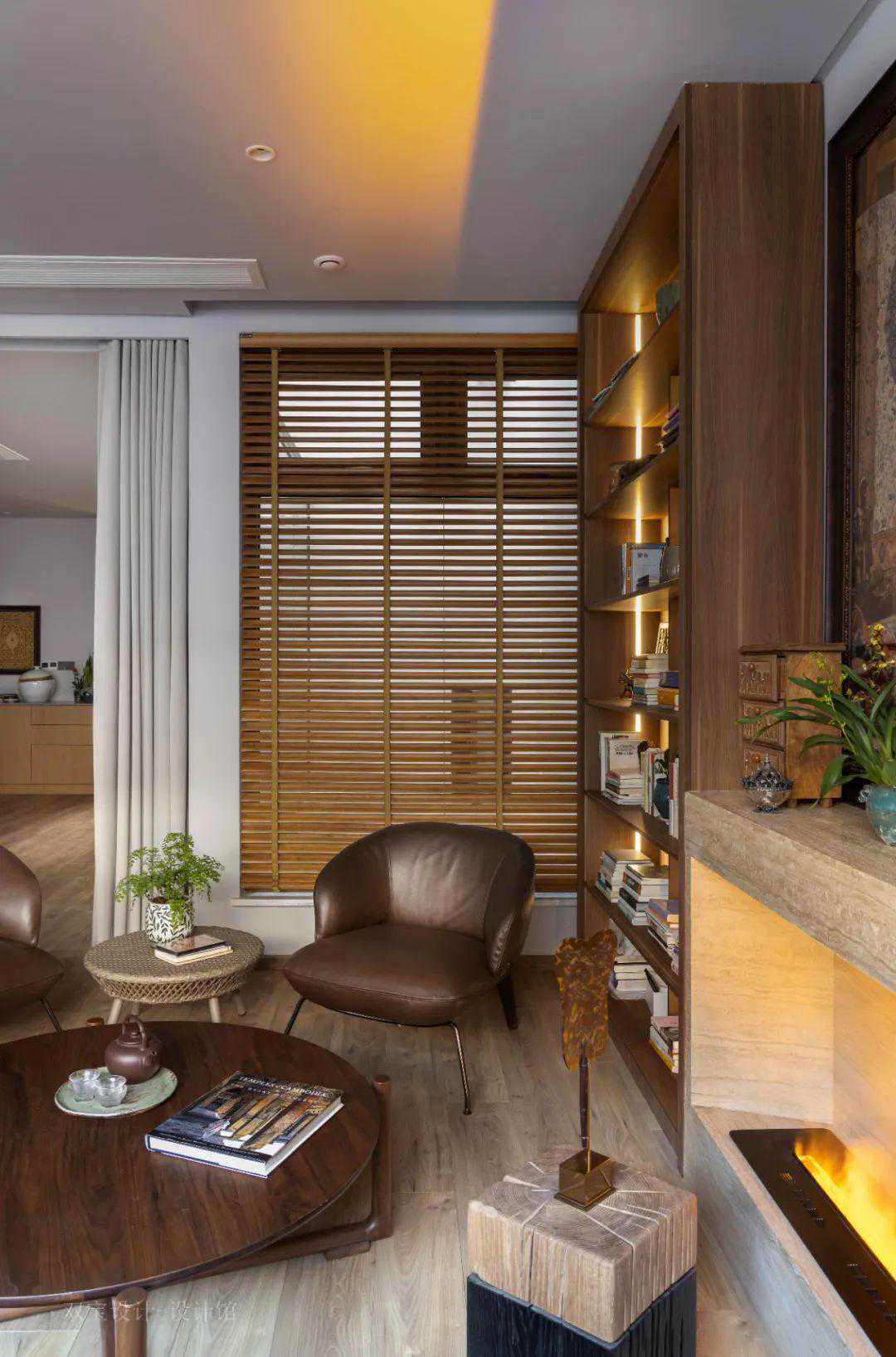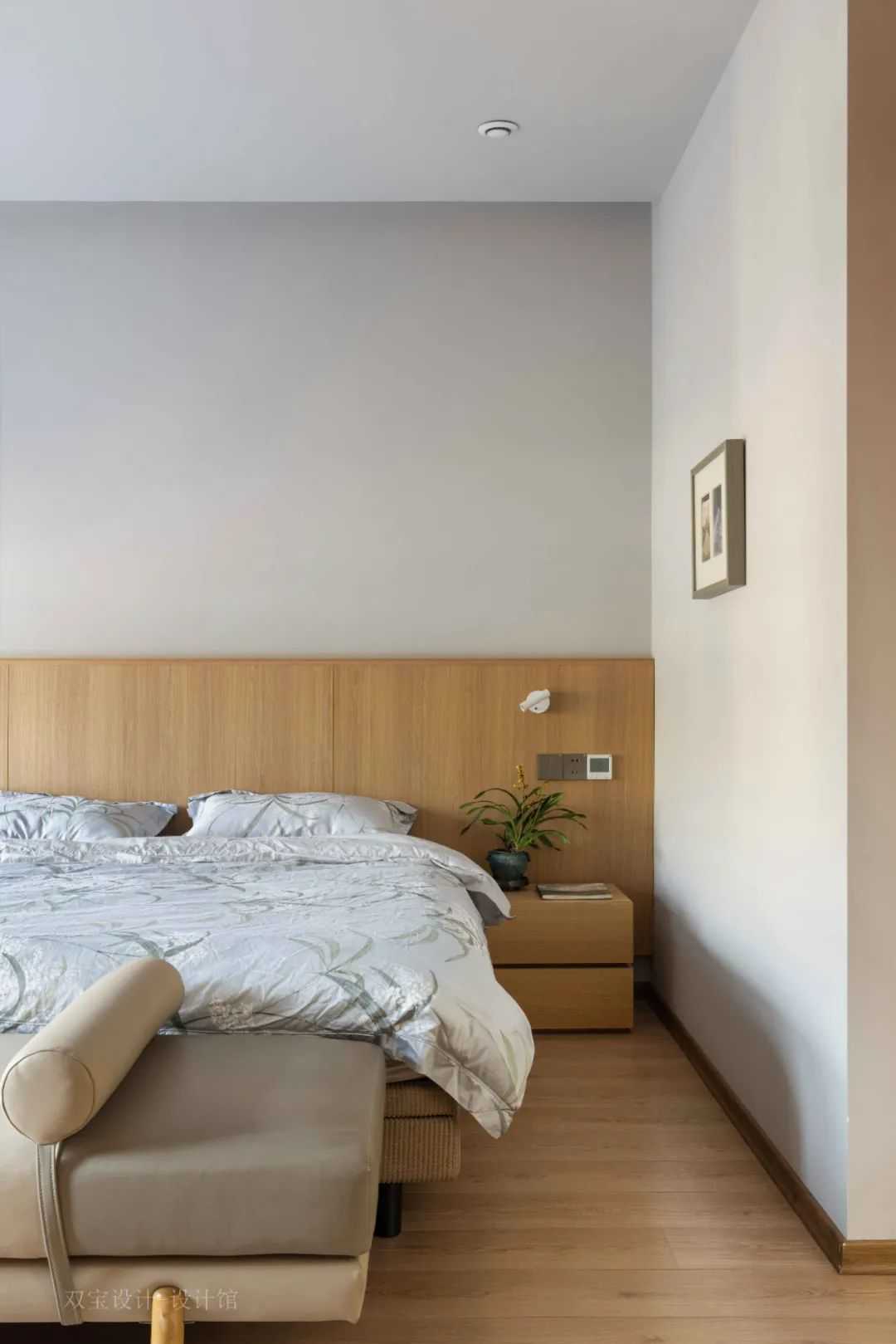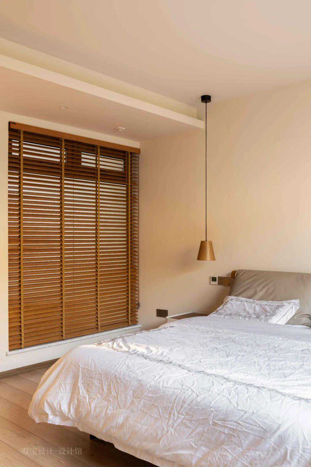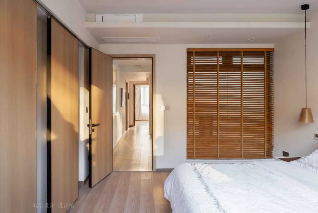 ▲床尾墙木饰面中暗藏了一扇隐形门,左侧加入木色百叶帘的设计,使得空间聪明简约舒适的高级氛围感。