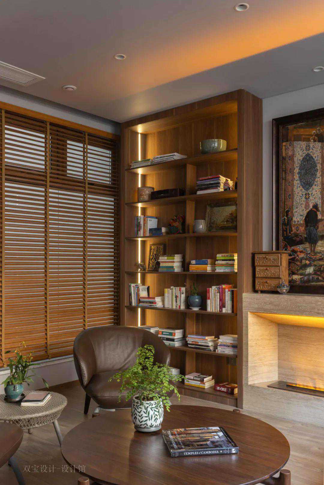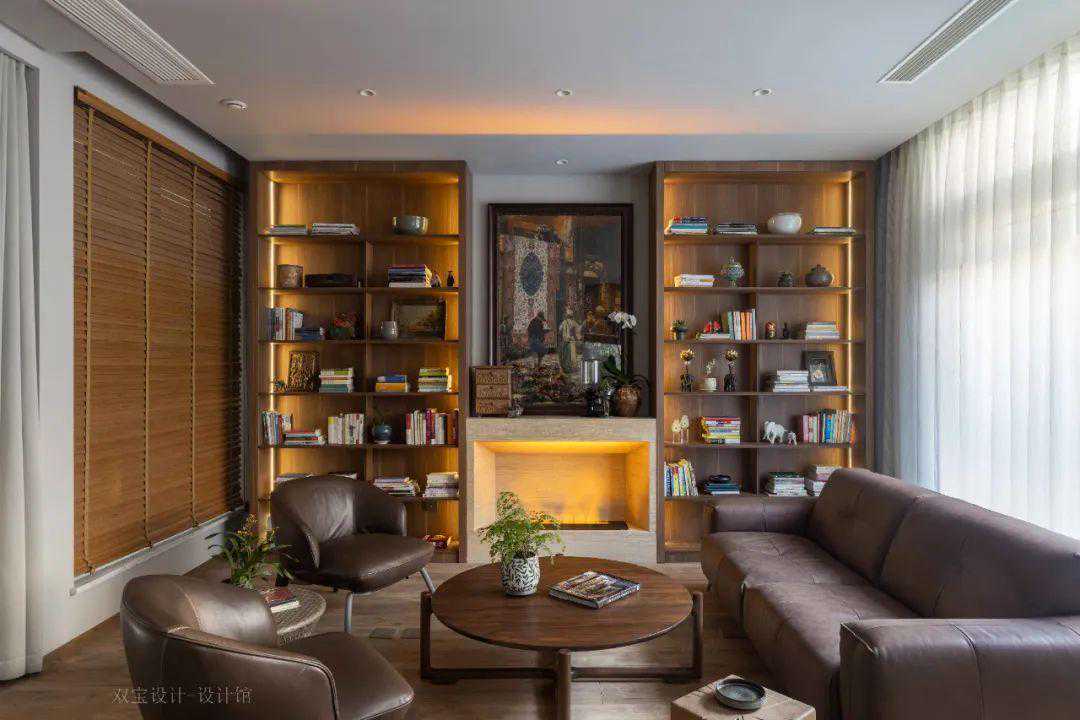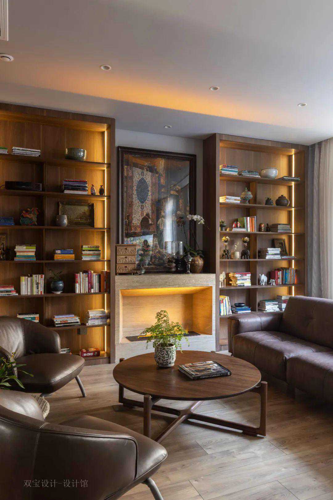 ▲地下室布置休闲沙发与茶几组合,背景墙以定制的展示柜的设计,并加入了壁炉的设计,营造出了一个端庄高级的休闲厅功能。