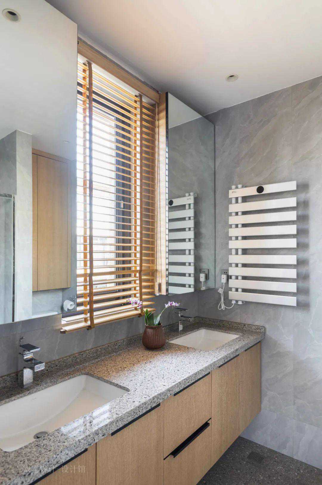 ▲卫生间在灰色水磨石地砖+浅灰色墙面砖的设计,洗手盆台面也是水磨石质感的设计,搭配木质浴室柜与百叶帘,营造出一个简约舒适而实用的卫浴空间。