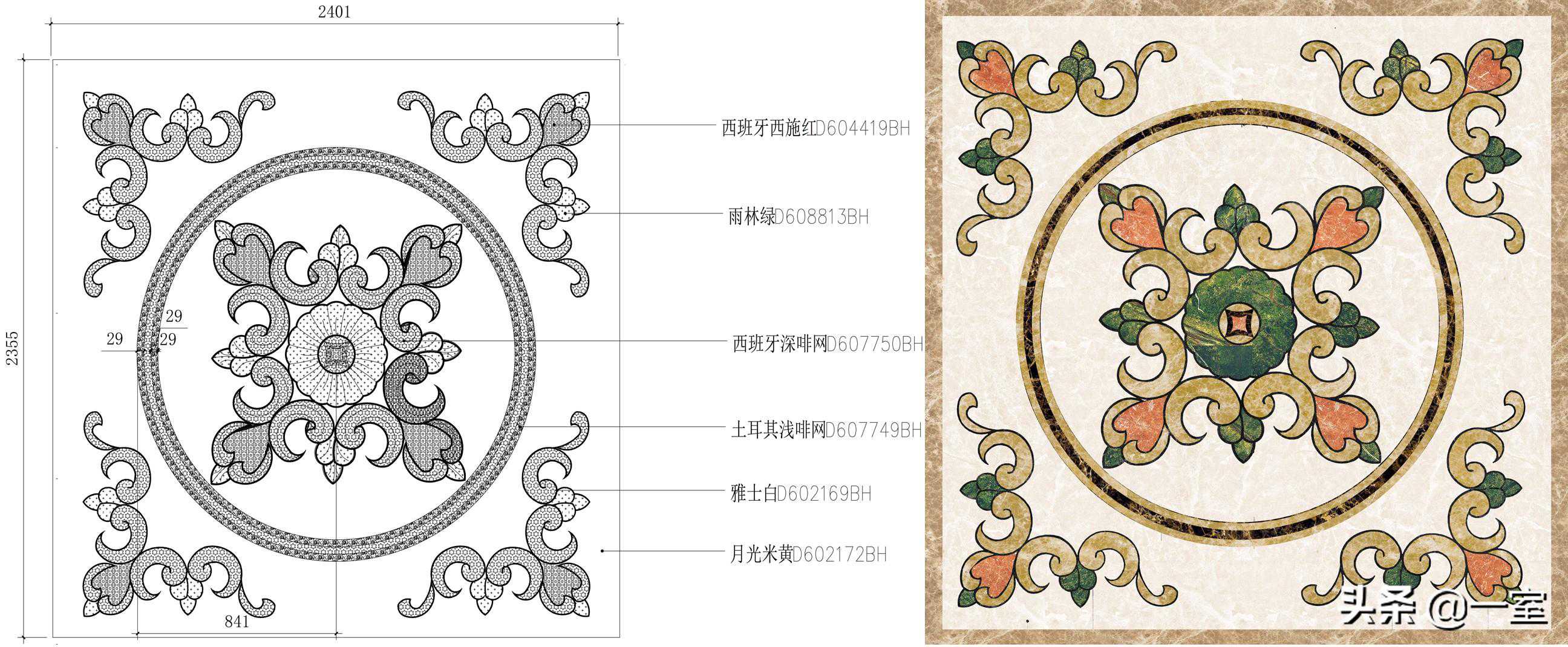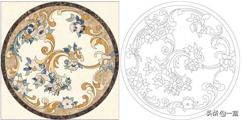 但当客户有需求或者一定要效果图上的拼花图案,却没有成品时,就需要根据图案来画图纸了,既费时又费力。这时候有和cad对应的拼花贴图就很重要了,可以免去对照片描图设计花纹的工序,直接效果图施工图一条龙服务。