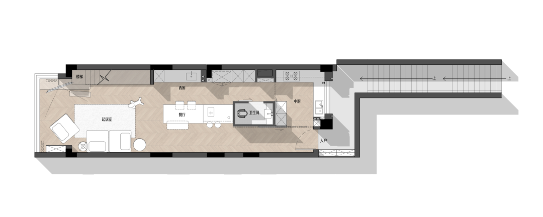 2、通过调整一楼楼梯及卫生间的位置形成双向洄游动线,增强空间的分区和流动性;