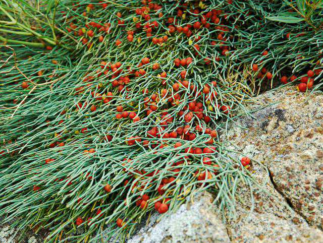 那么,木贼和麻黄在外形上有什么区别呢?首先,木贼高30~100厘米,直径6~8毫米,麻黄高20~40厘米,直径1~3毫米。很显然,木贼比麻黄长得多,也粗得多。其次,木贼是空心的,麻黄是实心的。此外,木贼不开花,麻黄开花。