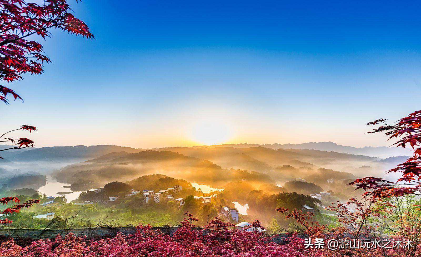 阳光下漫山遍野的红枫与天际线相连,似一道道火红夕阳铺满天边,红艳艳、金灿灿,蔚为壮观。