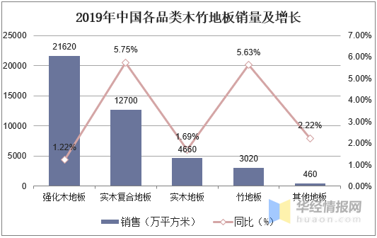 2019年我国具有一定规模的木竹地板企业总销量约42460万平方米,同比增长约1.68%,包括强化木地板销售21620万平方米,同比增长1.22%;实木复合地板销售12700万平方米,同比增长5.75%;实木地板销售4660万平方米,同比下降1.69%;竹地板销售3020万平方米,同比下降5.63%;其它地板销售460万平方米,同比增长2.22%。