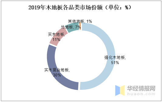市场份额占比方面,2019年强化木地板占比51%,实木复合地板占比30%,实木地板占比11%,竹地板占比7%,其他地板占比1%。