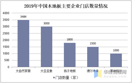 各企业门店数量方面,大自然家居门店数量为3484家,大亚圣象在国内拥有3000多个统一形象地板专卖店和700多家定制家居门店,扬子地板门店数量1800家,德尔未来门店数量为1500家,菲林格尔企业门店数量1000家。