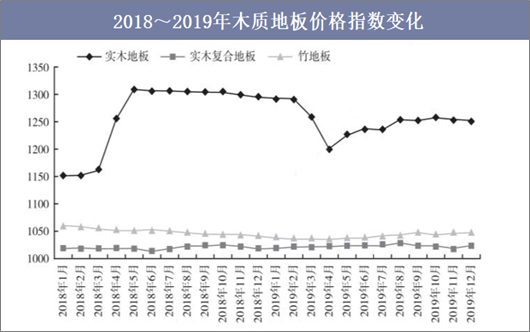 2019年,木质地板价格有所下降。实木地板价格明显高于实木复合地板和竹地板价格。实木地板平均价格指数为1251.81,比2018年下降1.83%;实木复合地板平均价格指数为1022.90,比2018年上涨0.30%;竹地板平均价格指数为1040.76,比2018年下降0.86%。