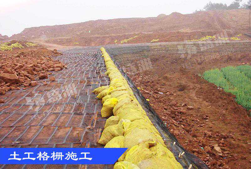 施工方法:清除原地面的杂物,铺设一层15cm~20cm的砂垫层,找平地面,履带推土机初步碾压,根据路基的设计宽度铺设土工布或土工格栅,将其人工拉紧崩直,然后用竹钉(20cm长)由中间向两侧将其固定在地面上,再依次铺设第二层砂垫层(厚度约25cm)后,继续第二层土工布或土工格栅的铺设施工。第一层与第二层土工布(或土工格栅)应错开覆盖搭接0.5m以上。
