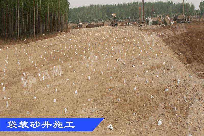施工方法是:采用砂井时,以设计砂井的长度定,当砂井设计较短时,可以由人工打入钢管,成孔后立即灌入粗砂,并边填边捣实,直至地面;当砂井设计较长时,可用履带吊机或带滚动的支架上加压重(或用穿心锤)和提拔设备插打钢管成孔。钢管底部带有活瓣桩尖,当钢管插打到标高后,边拔管边从管内灌入粗砂,直到地面。在有水源的条件下亦可采用高压射水成孔方法施工。而当采用袋装砂井时,则需要用履带吊机或能走行的自制吊架配上小型震动锤将钢套管打入地层中(带桩头),装砂袋从套管中放入地基、拨出套管,则砂袋便留在软土中,砂袋上端留有30cm左右余长,以便埋入地基表面铺设的砂垫层中,利于排水,砂垫层厚度一般为0.5m~0.8m,在软土地基沉降的过程中能使砂垫层始终露出原地面,保证地下水通过砂井及砂垫层顺利排出,加快软土排水固结,提高地基应力。石灰桩的施工方法同砂井,只是打好孔后立即在孔内混入粗砂与生石灰块的混合物,达到吸干水分,加快固结,提高土层承载力,稳定地层的目的。