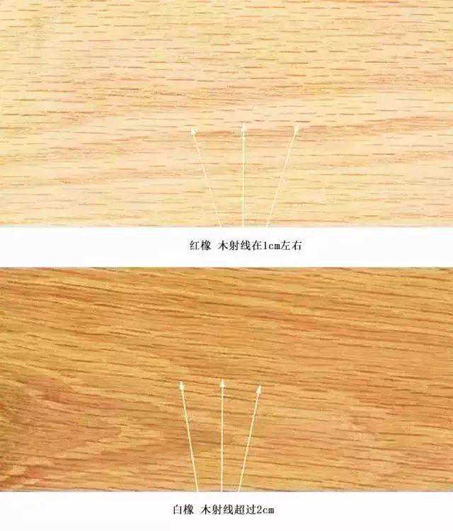 红橡的木射线相对较短,所以白橡比红橡具有更多的木纹,白橡的纹理也比红橡更细腻。