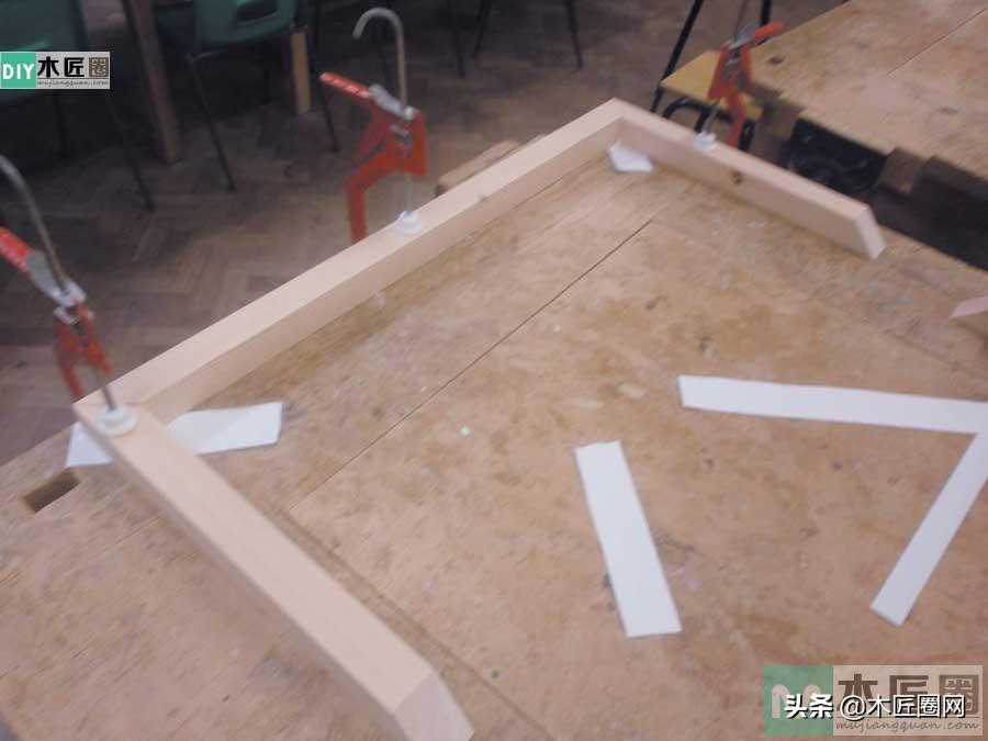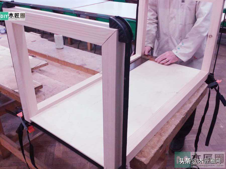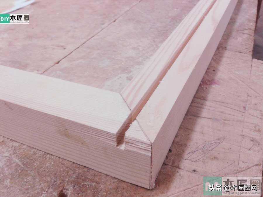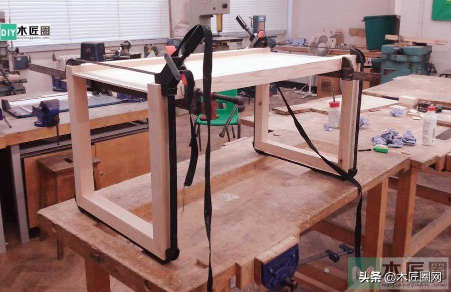 首先把二个做好的半边结构立放在木工桌上面,在半边结构下面链接上着地腿连,腿连用45角的夹角穿榫结构链接(下图)。上面部分把茶几底板(板厚约10mm)插入凹槽中,安装卡槽的时候要在凹槽接口处涂上胶水(设计图㈡结构),再打上小楔钉。安装好后再用固定带和F夹固定好茶几,待胶水干后取下即可。